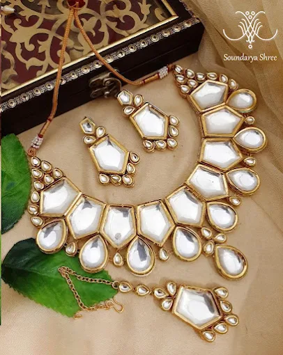 "SOUNDARYA SHRII having mastered the Designing, Assembling and Wholesaler art of Imitation jewellery for over many years, invite you to explore for yourself and treat yourself royally in an alluring range fashion jewelry that includes Antique Necklace, Chokar Set, Hasli set, Polki Kundan Set, Bridal Set(Dulhan Sets), Designer Earrings, Pendal Set, Kempu Stone Jewellery, Ruby Stone Jewelry, Kemp Designs, Bracelets, Bangles, Finger Rings etc. We are one of the leading Manufacturers, Wholesaler and Suppliers of a wide range of precious, semi precious and Artificial jewelry. We help people win hearts with style. The products of the company has etched a special place in the heart and mind of its esteemed customers for its flawless quality."